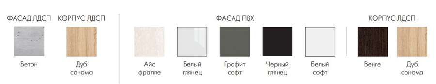 - Цвет: ЛДСП -Дуб Сонома/ Бетон, МДФ- Корпус Дуб Сонома или Венге, Фасад -айс фраппе, белый глянец, графит софт, черный глянец, белый софт.