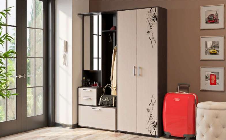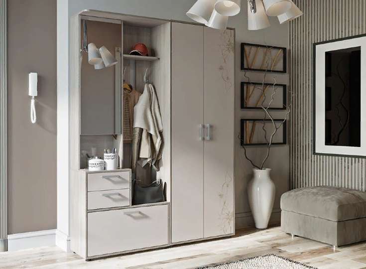 Современная, функциональная прихожая с рисунком на фасаде, включает в себя шкаф со штангой и тумбу с зеркалом и крючками.