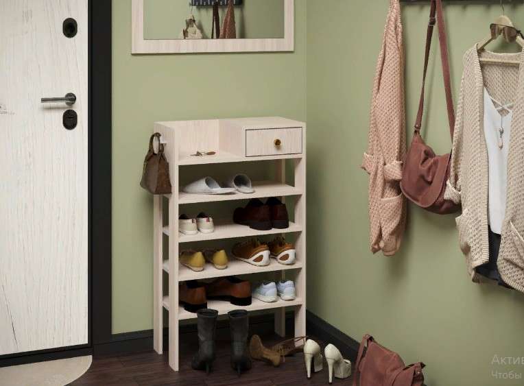 Недорогая, удобная в пользовании обувница-этажерка позволит разместить и вещи и обувь.