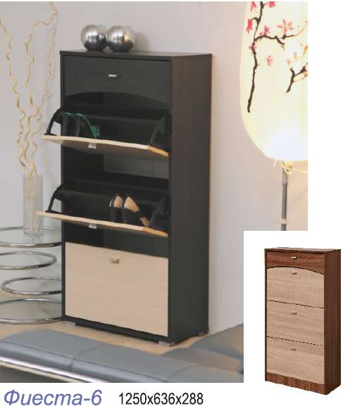 Презентабельная обувница «Фиеста-6» – современный представитель удобной корпусной мебели, используемой для хранения обуви в прихожих. Благодаря небольшим размерам её можно поставить даже в самое скромное по площади помещение.