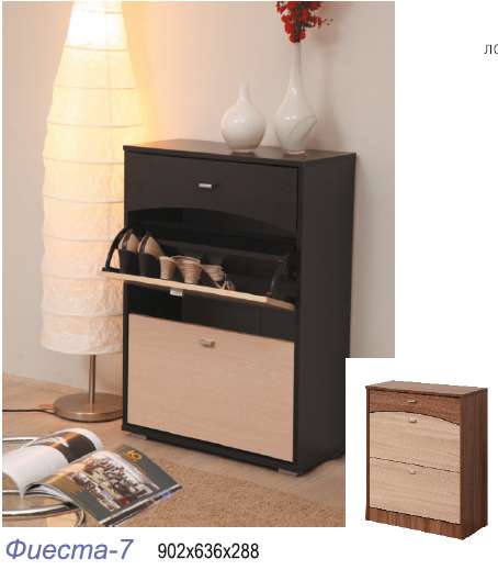 Красивая современная обувница «Фиеста-7», изготовленная из ЛДСП, прекрасно подходит для хранения обуви. Она отличается компактностью, поэтому хорошо вписывается в прихожие комнаты самого разного размера.