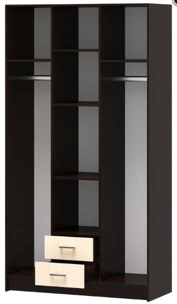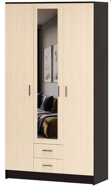 Шкаф "Трио" с зеркалом, комбинированный 3-створчатый, с 2-мя ящиками на роликовых направляющих. Предназначен для хранения белья и верхней одежды. Комплектуется 2-мя поперечными металлическими штангами. Шкаф "Трио" совместим со всеми распашными шкафами серии "София".
