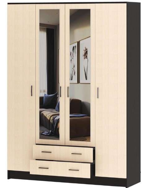 Шкаф "Квадро" с зеркалами комбинированный 4-створчатый, с 2-мя ящиками на роликовых направляющих. Предназначен для хранения белья и верхней одежды. Зеркала выполнены с обработкой "фацет". Комплектуется поперечной металлической штангой. Шкаф "Квадро" совместим со всеми распашными шкафами серии "София".