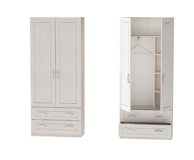 Вместительный 2-х дверный шкаф - это классика, проверенная временем. Он удобен, надёжен и функционален для любого пользователя. За распашными дверями находятся: антресольная полка, ниша с тремя полками для белья, выкатная штанга для одежды; внизу - два больших выдвижных ящика.
