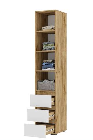 Пенал с закрытой системой хранения состоит из 4 полок за глухой створкой и трех выкатных ящиков с шариковыми направляющими полного выдвижения.