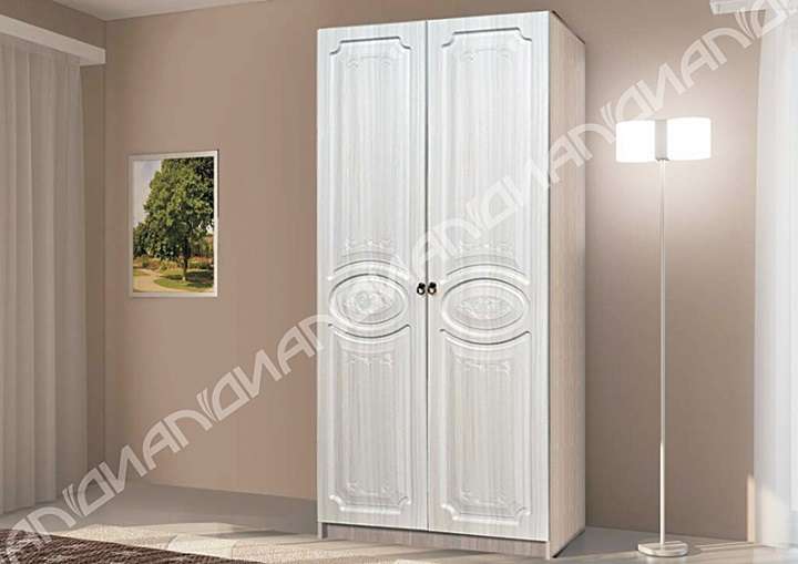 Шкаф двухстворчатый выполнен в классическом стиле. Изящные формы, рельефный рисунок на фасадах и стилизованные под старину мебельные ручки сделают вашу спальню самым уютным местом в доме! За распашными дверями находится отделение с четырьмя полками для белья, антресольная полка и металлическая штанга для размещения одежды.
