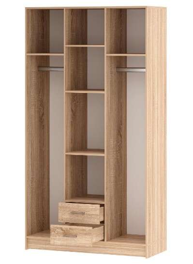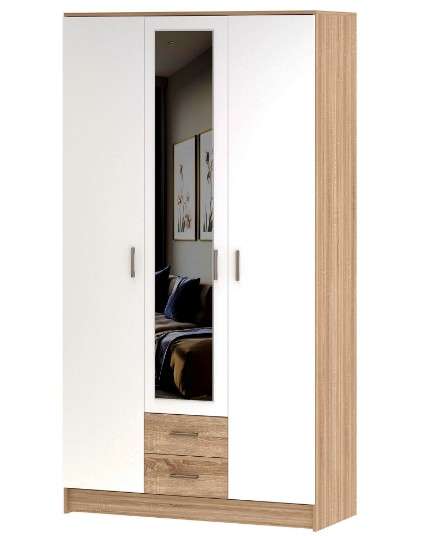 Комбинированный 3-створчатый шкаф с зеркалом, с 2-мя ящиками на роликовых направляющих. Предназначен для хранения белья и верхней одежды. Зеркало выполнено с обработкой "фацет". Комплектуется 2-мя поперечными металлическими штангами. Шкаф "Трио" совместим со всеми распашными шкафами серии "Беатрис".