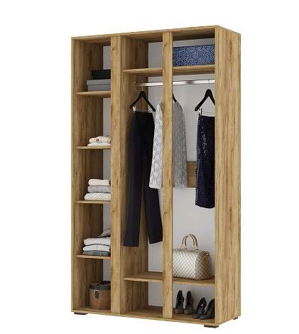 Трехстворчатый шкаф с хромированной штангой для одежды и боковой секцией с закрытыми полками, средняя створка которого декорирована зеркалом, обработанным еврокромкой.