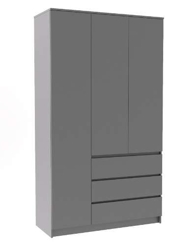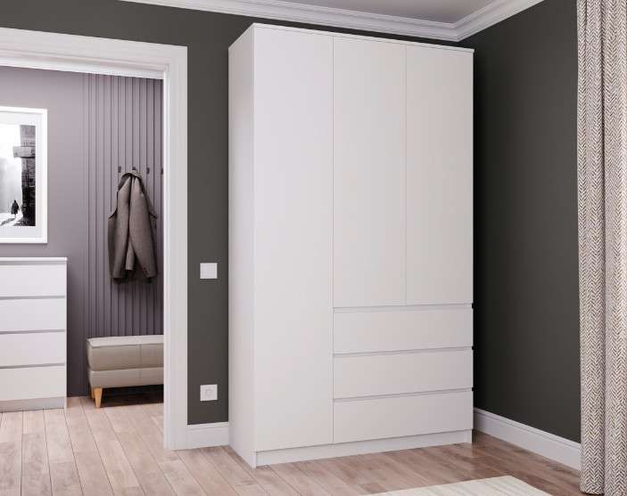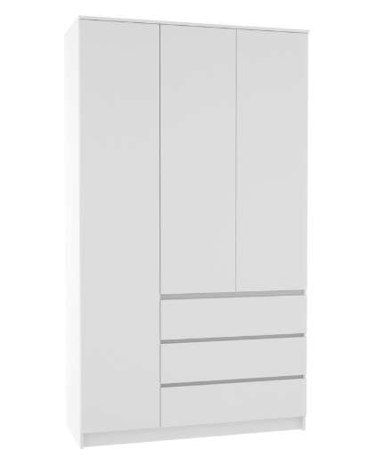 Шкаф с тремя распашными створками и тремя выдвижными ящиками , укомплектован большим количеством полок и штангой для одежды.