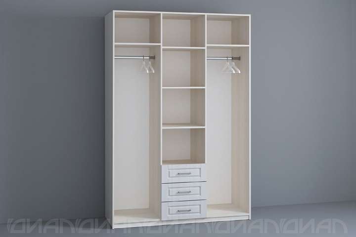 Внутреннее наполнение: две крайние секции со штангой для одежды и полкой, средняя секция с тремя полками и тремя ящиками на шариковых направляющих (система полного выдвижения).