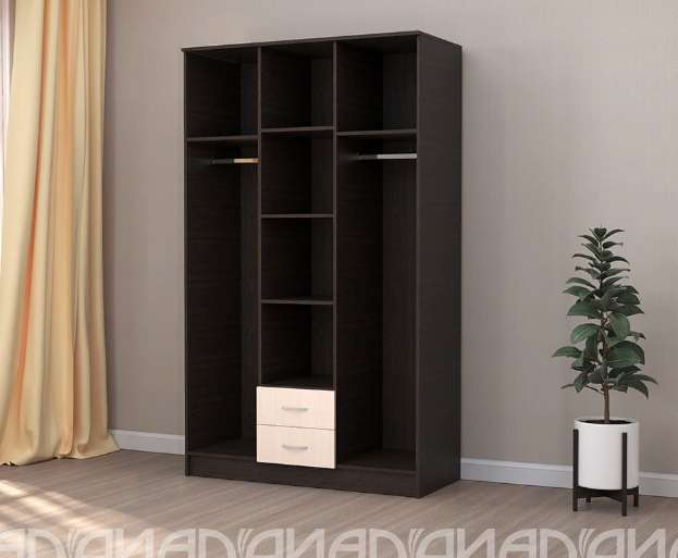 Внутреннее наполнение: две крайние секции со штангой для одежды и антресольной полкой, центральная - с тремя вместительными полками и двумя выдвижными ящиками.