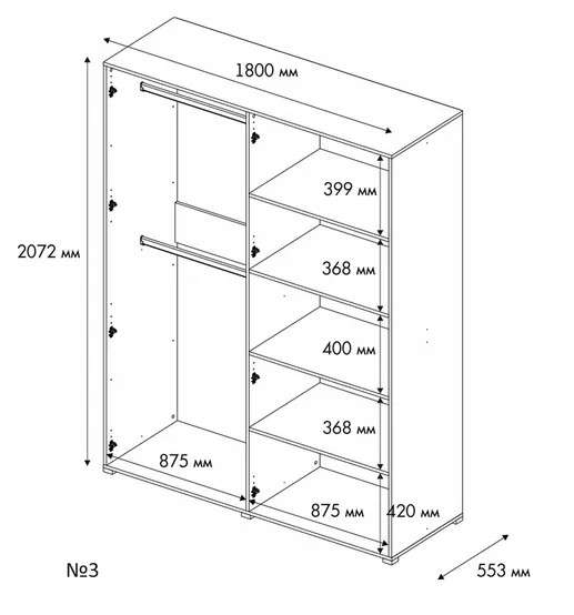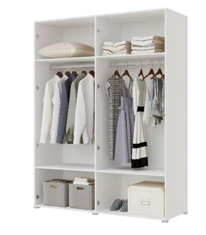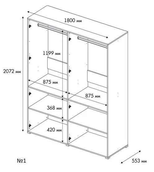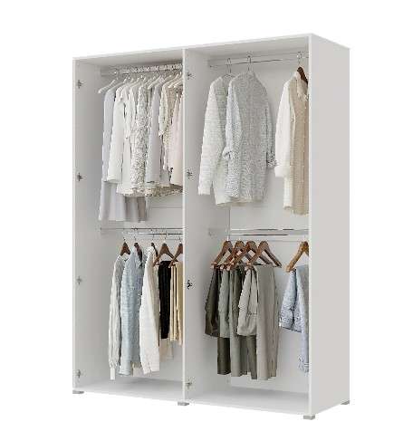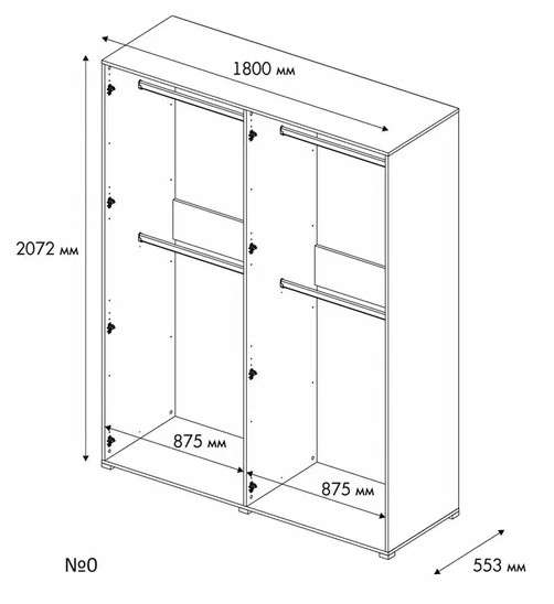 Шкаф 4-х дверный 1800 в базовой комплектации идет с четырьмя штангами, к нему можно докупить полки и зеркала.