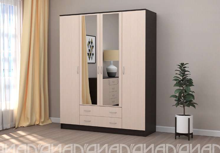 Шкаф большой и вместительный 4-х дверный с ящиками. За распашными дверями в левой и правой части шкафа находятся отделения с четырьмя полками для белья. В центральной части шкафа находятся антресольная полка и металлическая штанга для размещения одежды, внизу два больших выдвижных ящика на роликовых направляющих.