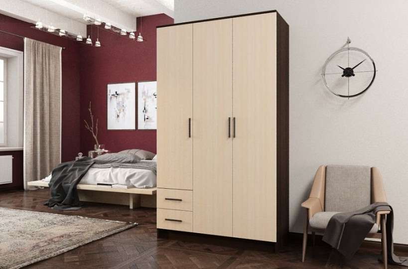Практичный и функциональный шкаф распашной №5 изготовлен из ламинированной ДСП. Это трехстворчатая модель дополненная двумя выдвижными ящиками. Простой и лаконичный дизайн подходит к любым современным интерьерам. Расцветка и текстура отделки стилизованы под древесину дуба оттенков венге и молочный. Скромная фурнитура отлично сочетается с гладкими, не отягощенными декорированием фасадами.