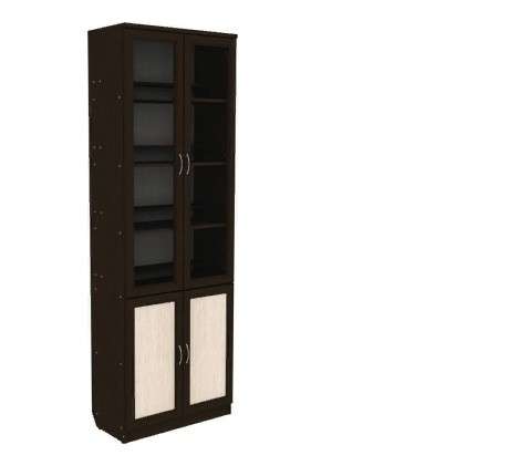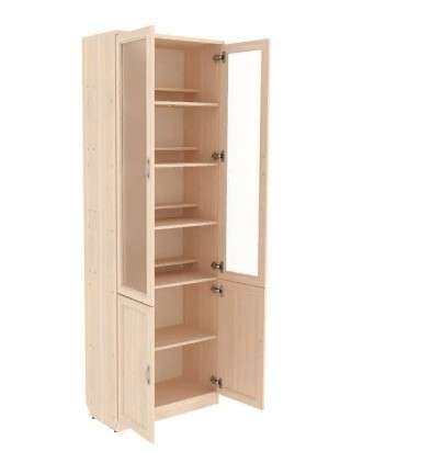 - Шкаф состоит из двух частей – верхних открытых полок за стеклянными дверцами и нижних закрытых за деревянными сплошными дверями.