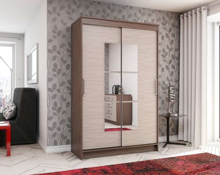 Шкаф-купе отлично будет смотреться в спальне или прихожей. Шкаф-купе разделен на два отделения, одно из которых предназначено для размещения одежды на вешалках и комплектуется штангой. Второе отделение комплектуется полками.