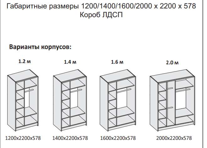 Выполняется шкаф-купе в четырех размерах: шириной 1,2м, 1,4м, 1,6м, 2,0м.