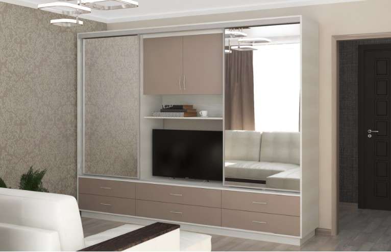 Спокойные оттенки и наличие зеркал зрительно увеличат пространство, а вместительная система хранения позволяет всегда держать нужные вещи под рукой. В дверях-купе используется толстостенный алюминиевый профиль системы Версаль с усиленными ребрами жесткости, на фасадах - торцевые и ручки-скобы. Отдельные секции с вешалками, полками, выдвижными ящиками и отдельной нишей под ТВ - это, пожалуй, лучшая идея для небольшой квартиры.