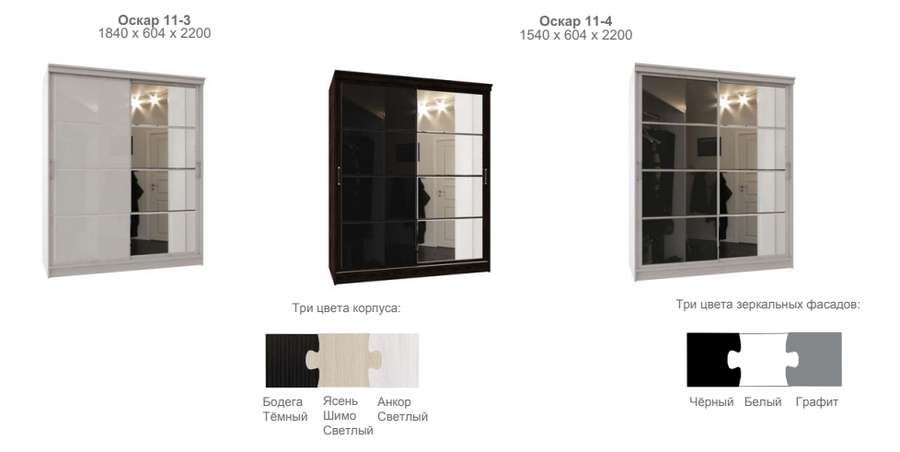Шкаф-купе «Оскар» выполняется в двух размерах и трех цветовых сочетаниях.