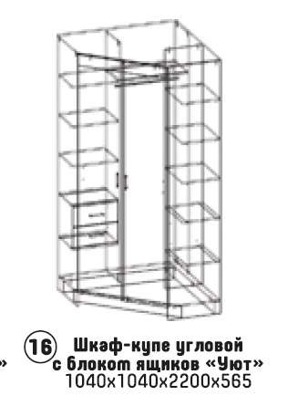 Комбинированный угловой шкаф-купе «УЮТ» София предназначен для хранения белья и верхней одежды. Комплектуется поперечной металлической штангой. Имеет в комплекте блок из двух ящиков на роликовых направляющих, устанавливаемые на левую или правую стороны.
