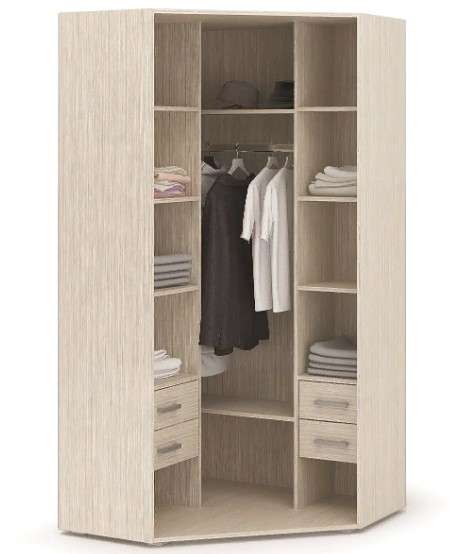Шкаф угловой 2-х створчатый из модульной системы «Симба», имеет необычный дизайн, вместительные полки по бокам, четыре выдвижных ящика с роликовыми направляющими, стационарную штангу, что позволит разместить большое количество одежды и вещей.