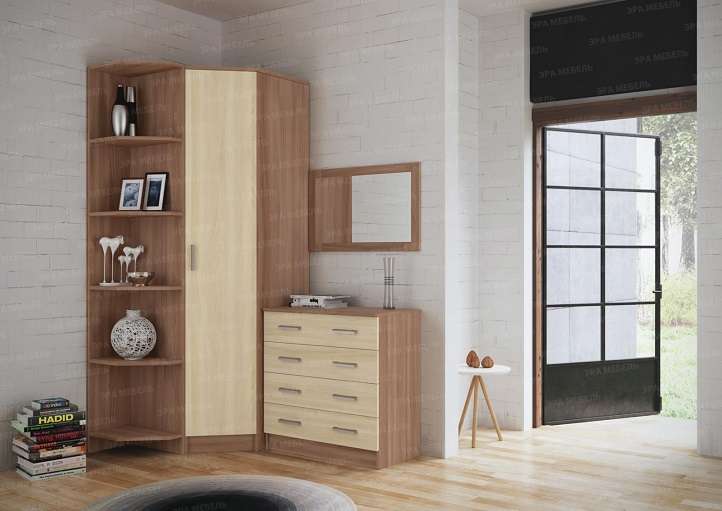 Можно заказать комплект мебели ,как на второй фото : шкаф угловой ,комод,зеркало и угловое завершение, Размер: ШхВхГ: комод- 800х830х440-4200 руб, зеркало- 800х500-1200 руб., угловое завершение-487х2200х285-2700 руб.. Цена комплекта -16100 руб.