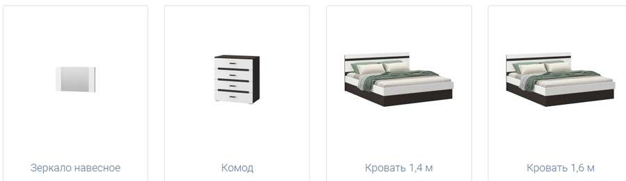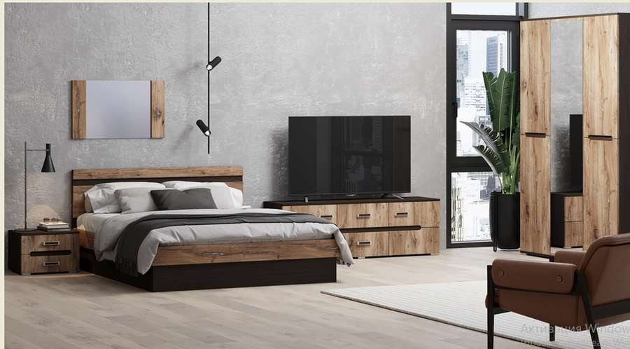 Цена указана за комплект на фото: Кровать 1,6м, Тумба прикроватная, Тумба ТВ, Шкаф 3-х ств., зеркало в комплект не входит.