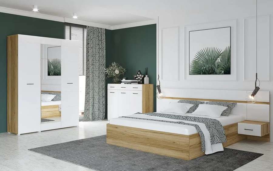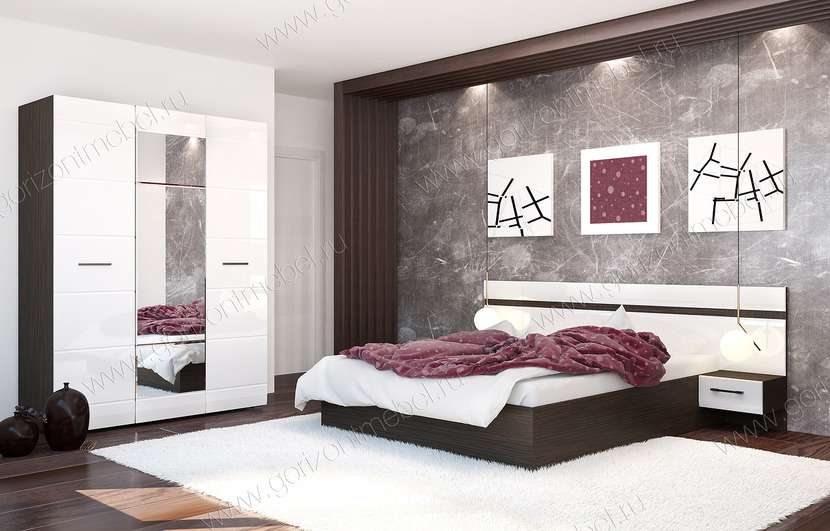 Цена указана за комплектацию на фото в цвете Венге - Белый глянец : Шкаф 3-х ств. Кровать 1,4м с ортопедическим основанием, две тумбочки с надстройками.