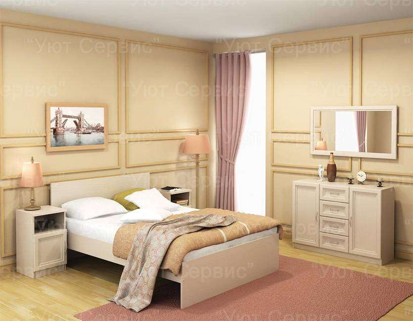 Функциональная простота этого изысканного варианта мебели для спальни очень эффектна. Стильная современная кровать, 2 симпатичные компактные тумбочки, милый классический комод и , конечно, зеркало - от всего этого веет теплом и уютом.