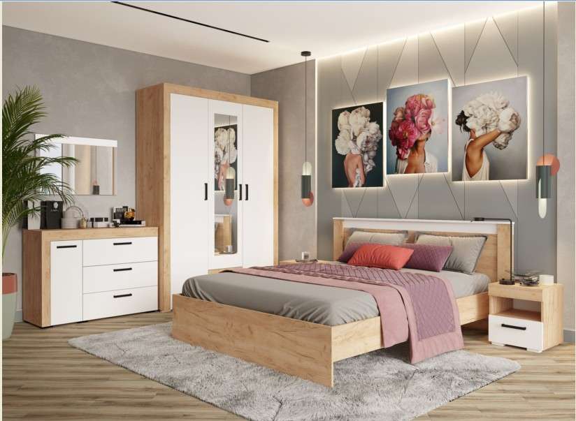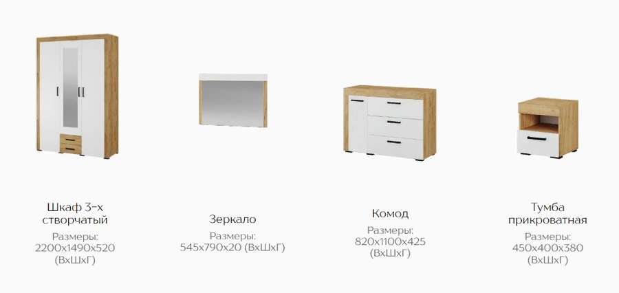 Цена на сайте указана за комплект на первой фото: Шкаф 3-х ств., Комод, Зеркало, Кровать 1,6м и две прикроватные тумбы.