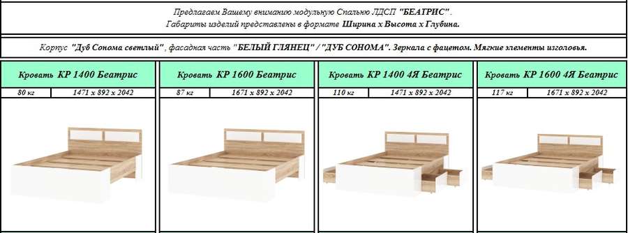 Все варианты кроватей "Беатрис" имеют 2 размера по ширине спального места на 1,4 и 1,6 метра и могут быть выполнены с ящиками и без.