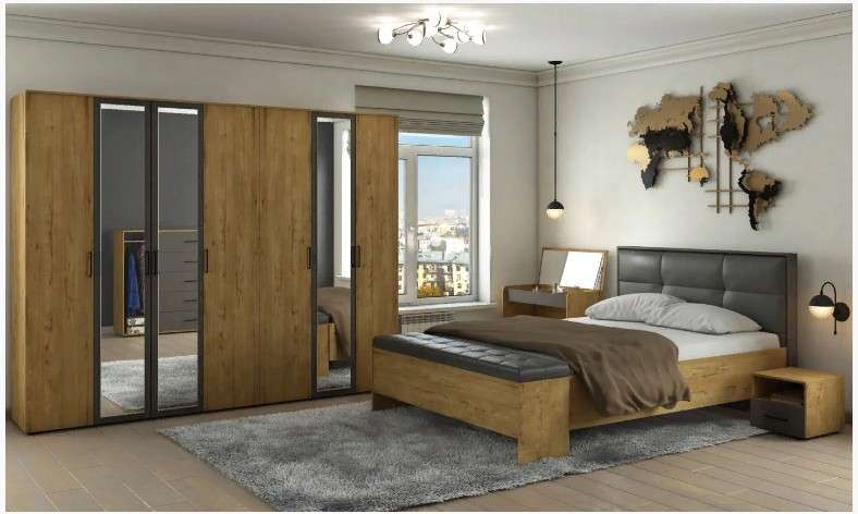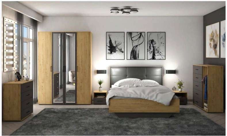 Модульная коллекция Бруно с тщательно продуманным дизайном – гарантия уюта и комфорта в доме. В этой коллекции мы используем два вида материала для основных элементов ЛДСП и Кожзам для мягкой отделки декора кровати у изголовья.