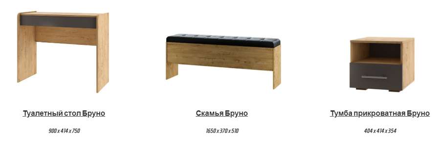 На сайте указана за комплект на первой фото: Кровать без ПМ, Две прикроватные тумбы, Шкаф трёхдверный Бруно, Туалетный стол Бруно, и Комод Бруно узкий (На фото идет со штангой).