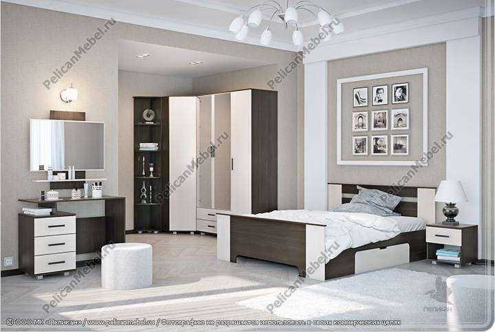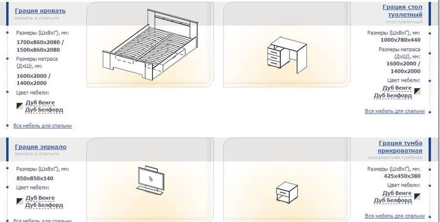 * Цена указана за комплектацию на фото с кроватью большего размера (спальное место 1600х2000). Элементы: Грация шкаф угловой, Грация шкаф, Грация пенал с полками, Грация угол, Грация кровать, Грация стол туалетный, Грация зеркало, Грация тумба прикроватная.