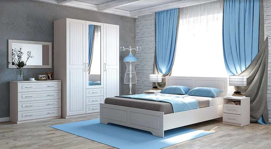 Цена указана за комплект на фото: Шкаф 3-х створчатый, Кровать арт.017 (Настил) 1,4м, Комод с четырьмя ящиками, Две тумбы прикроватных, Зеркало.