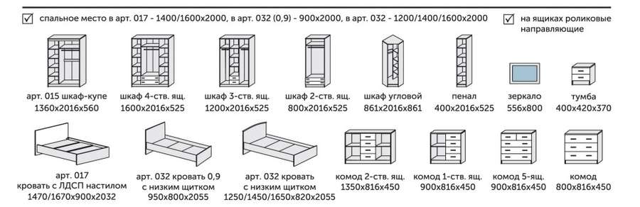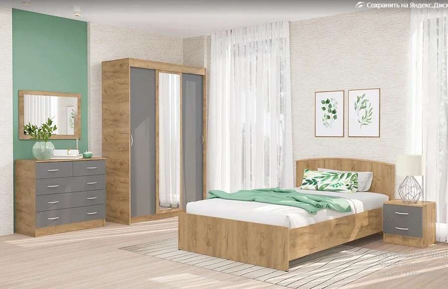 Цена на сайте указана за комплект на первой фото: Кровать 1,4 арт.032 низкий щиток , Тумба, Шкаф-купе арт.015 , Комод 5 ящиков, Зеркало.
