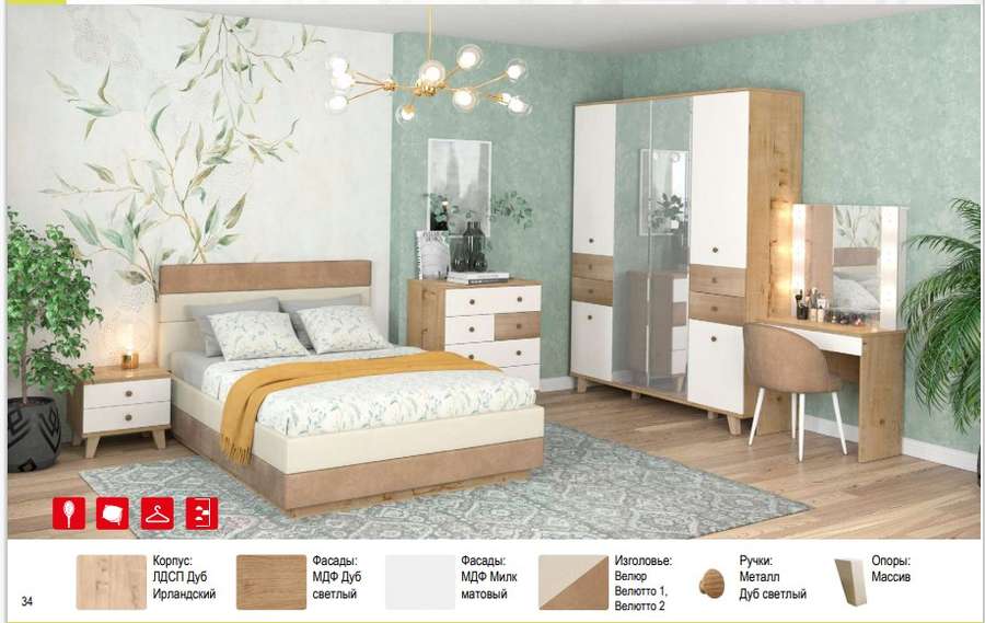 Цена указана за комплект на фото: №14М Кровать 1400, №13 Тумба прикроватная , №9,2 Комод 800, №24 Шкаф 4-х створчатый с ящ., №12.2 Стол универсальный, №4,2 Зеркало с подсветкой