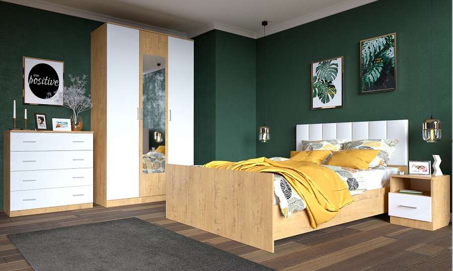Цена указана за комплект : Кровать 1,4 (с мягкой спинкой МДФ настил) , две тумбы прикроватные, Комод, Шкаф трехстворчатый .