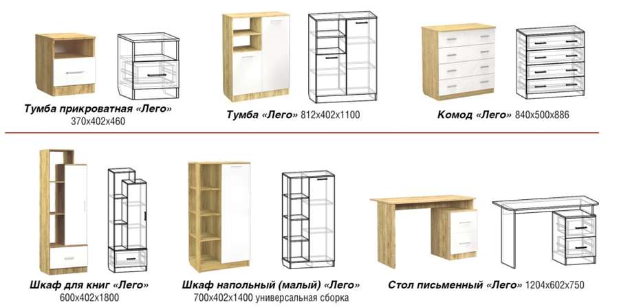 Мебельный гарнитур «Лего» – элегантный комплект, способный украсить спальню и создать комфортные условия для отдыха.