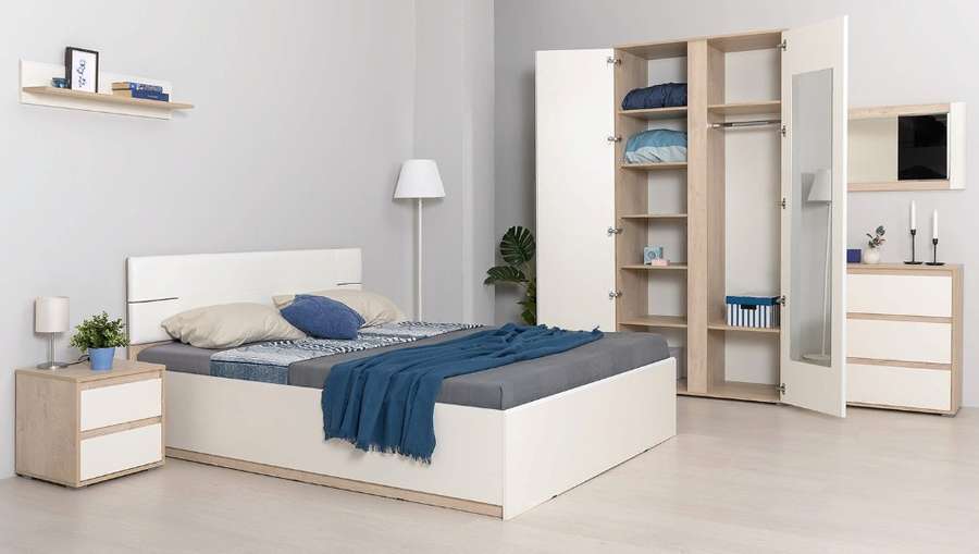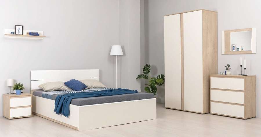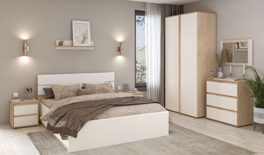 - В комплект входит кровать с ортопедическим основанием . две прикроватных тумбочки, вместительный шкаф,зеркало ,комод и полка.