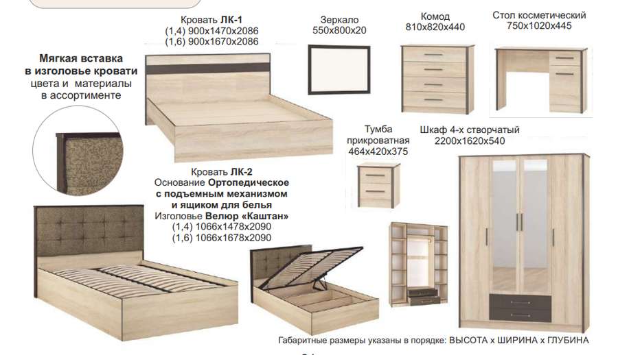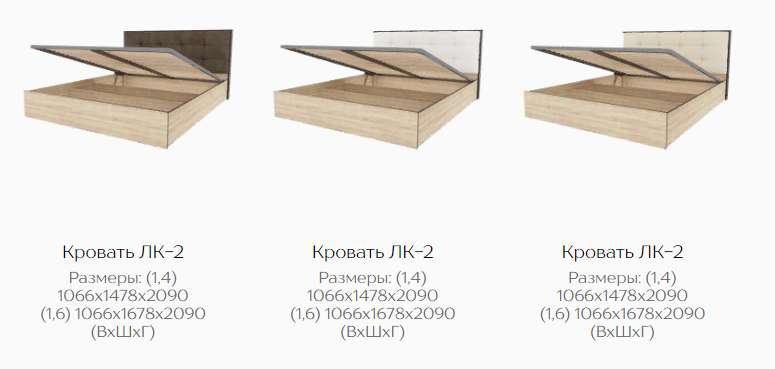 В коллекции на выбор представлены кровати: ЛК-1 с основанием настил из ДСП и жестким изголовьем и ЛК-2 с тремя видами основания: настил из ДСП, ортопедическое на независимых опорах или ортопедическое с подъемным механизмом и ящиком для хранения белья и мягким изголовьем цвета: ЭКОкожа «Милк», велюр «Кофейный» или велюр «Карамель».