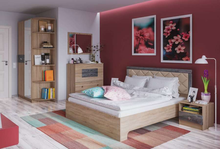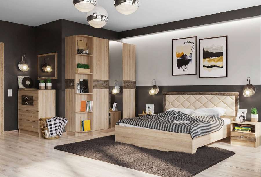 В линейке шкафов представлен дополнительный модуль - торцевой шкаф, альтернатива обычному угловому завершению. Данный модуль собирается на любую сторону. Спальный гарнитур может быть исполнен в двух цветовых решениях с накладками цвета Дуб Шале Мореный и Дуб Шале Серебро.