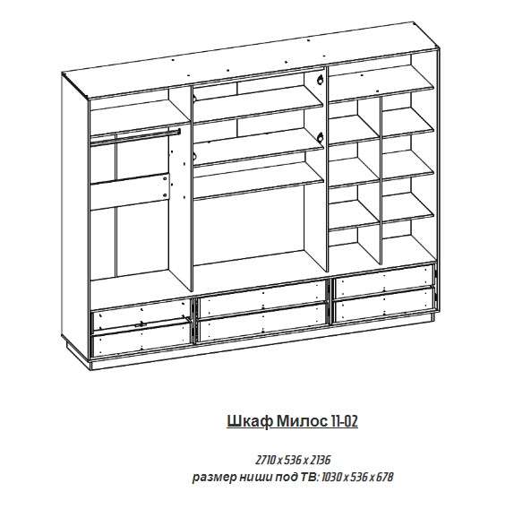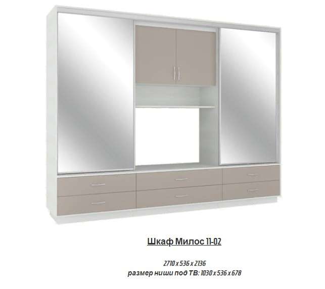 Шкаф-купе «Милос 11.02» (Атлант)Шкаф-купе «Милос 11.02» Сочетание стиля и комфорта. ШКАФ-КУПЕ МИЛОС 11-02 Прекрасный вариант для гостиной: Отдельные секции с Вешалкой, Полками, Выдвижными ящиками, а также нишей под ТВ: 1030х536х678 мм. Спокойные оттенки и наличие зеркал зрительно...