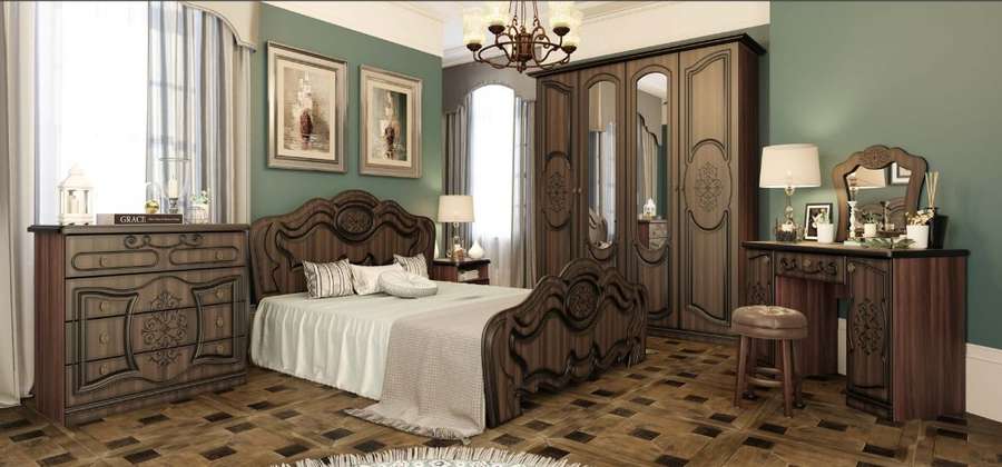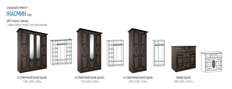 Лучшие черты классического стиля воплотил в себе спальный гарнитур «Жасмин». Для него характерны эргономичность, функциональность и красота. Дизайн гарнитура отличают симметричность, правильные овалы и плавные изгибы. Особенно привлекательно смотрятся резные элементы. Глубокие оттенки коричневого цвета и текстура натуральной древесины придают мебели аристократизм и благородство.