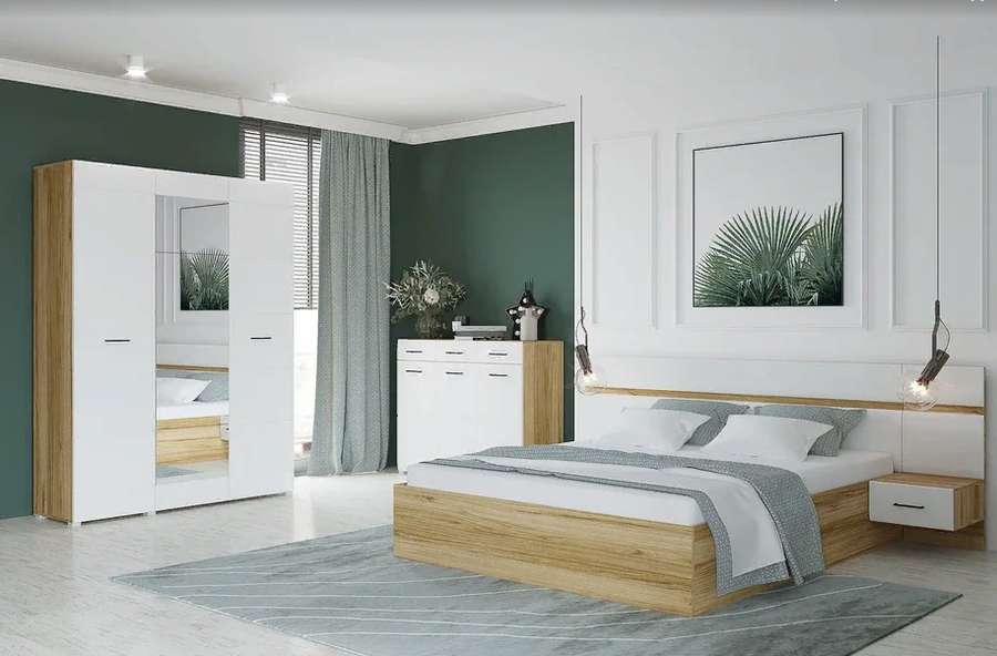 Цена указана за комплектацию на фото в цвете Крафт золотой-Белый : Шкаф 3-х ств. Кровать 1,4м с ортопедическим основанием, две тумбочки с надстройками, Комод.