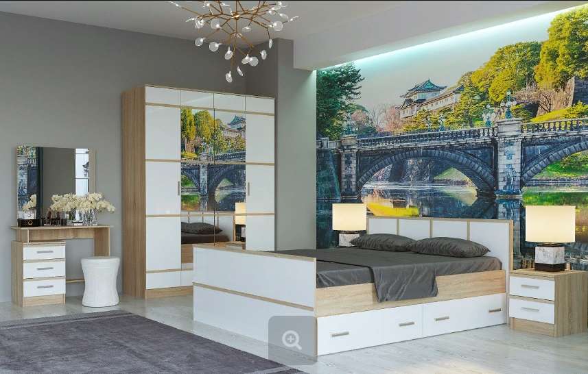 Цена указана за комплект на фото: Шкаф 2-х створчатый с зеркалом-2 штуки , Кровать 1600 с ящиками ,Косметический стол,, две прикроватные тумбы .