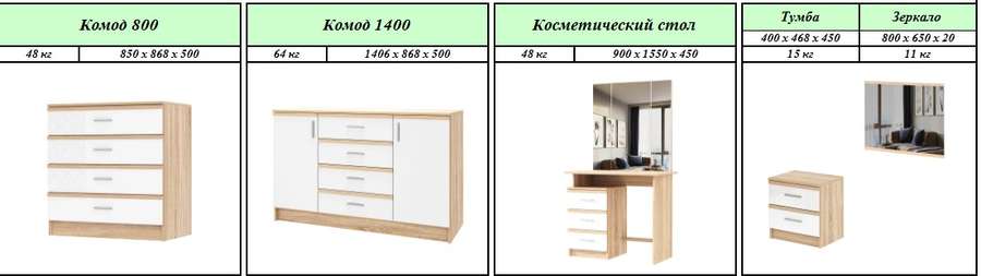 Цена указана за комплект на фото: Косметический стол, тумба прикроватная-2 шт., кровать КР1400, шкаф-купе 3-х створчатый, комод К1400.