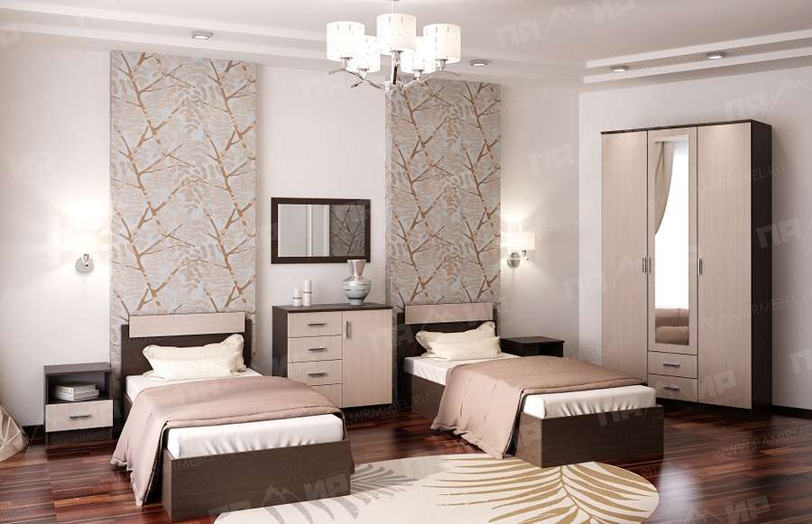- Состав композиции по модулям: Шкаф «Трио», комод К800 1Д, кровати КР900, зеркало, тумба прикроватная-2шт