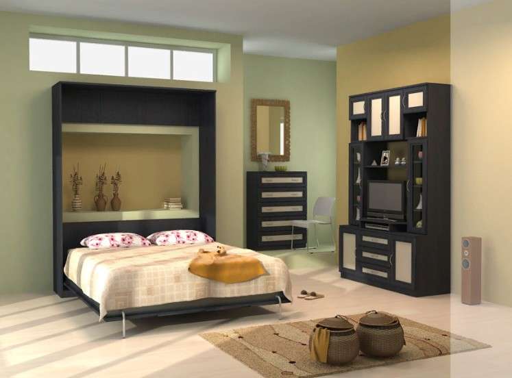 В собранном виде эта кровать представляет собой классическую модель четырехдверного шкафа с зеркалом или без него. Процесс складывания очень прост, происходит он за считанные секунды, благодаря надежным креплениям и практичным механизмам.