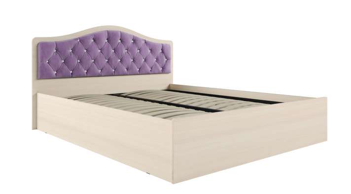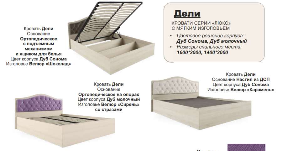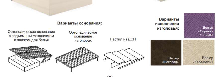 Варианты исполнения мягкого изголовья: велюр «Сирень» со стразами, велюр «Шоколад» или велюр «Карамель»